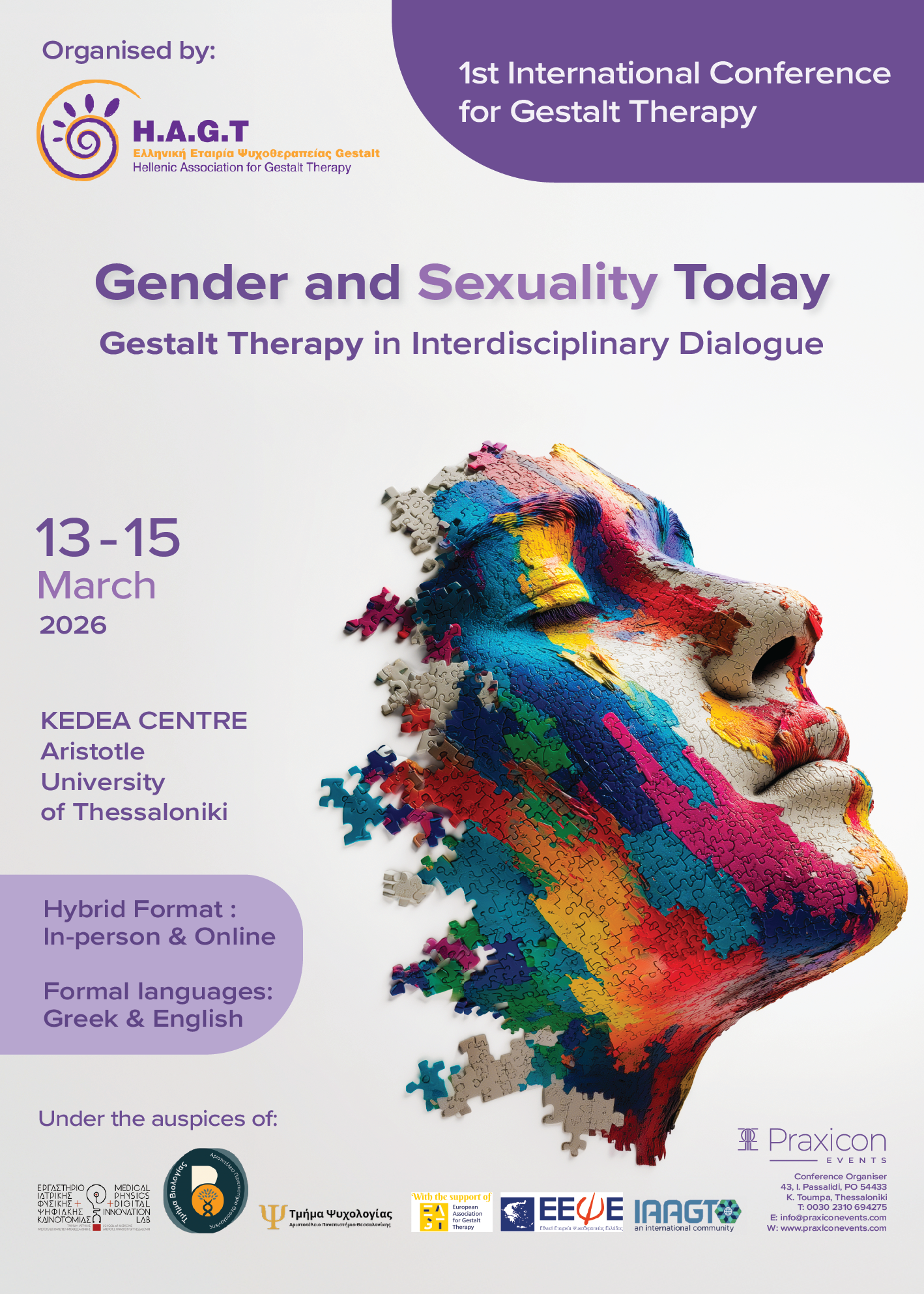 Our joy and responsibility are even greater, as this conference is held under the auspices of the Aristotle University of Thessaloniki, specifically its Departments of Psychology, Biology, and Medical Physics, as well as the European Association for Gestalt Therapy (E.A.G.T.), the National Organisation for Psychotherapy of Greece (N.O.P.G.) and the International Association for the Advancement of Gestalt Therapy (I.A.A.G.T.).