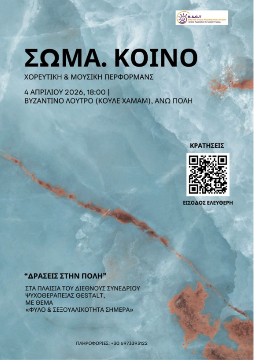 The Hellenic Association for Gestalt Psychotherapy (HAGT), in collaboration with the “Actions in the City” program, invites you to the dance and music performance “Body.Common”, an experiential event that moves at the boundary between performance and ritual.